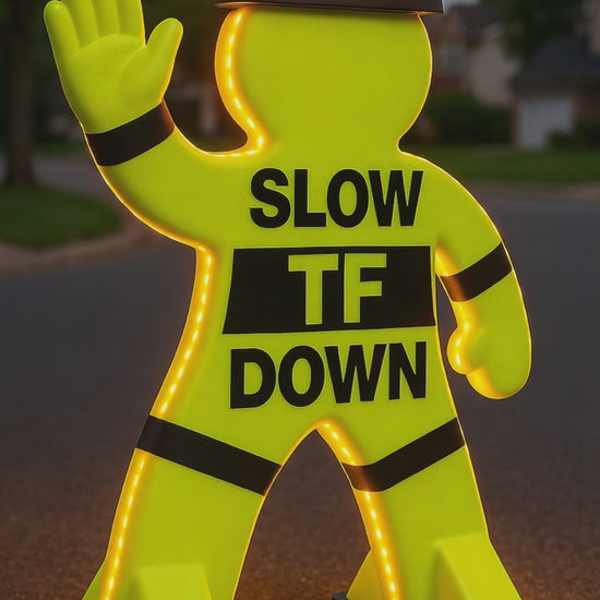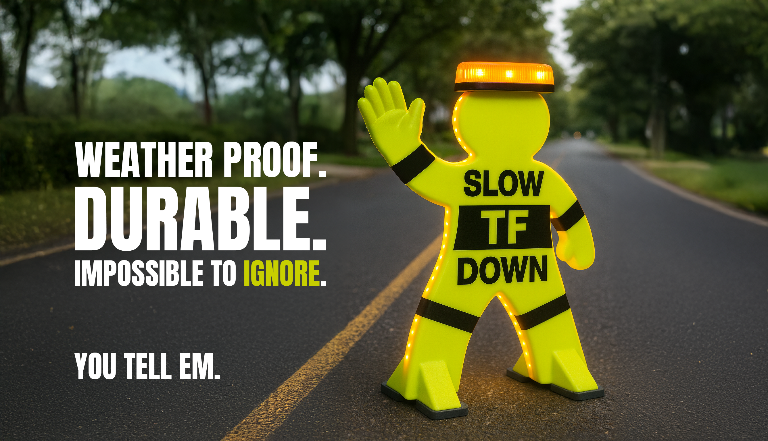 “We live on a bend where people fly through at sunset. Officer Bob’s light bar grabs attention immediately and we’ve noticed drivers tapping the brakes before they reach our driveway. It’s sturdy, simple, and the battery lasts all weekend.” -